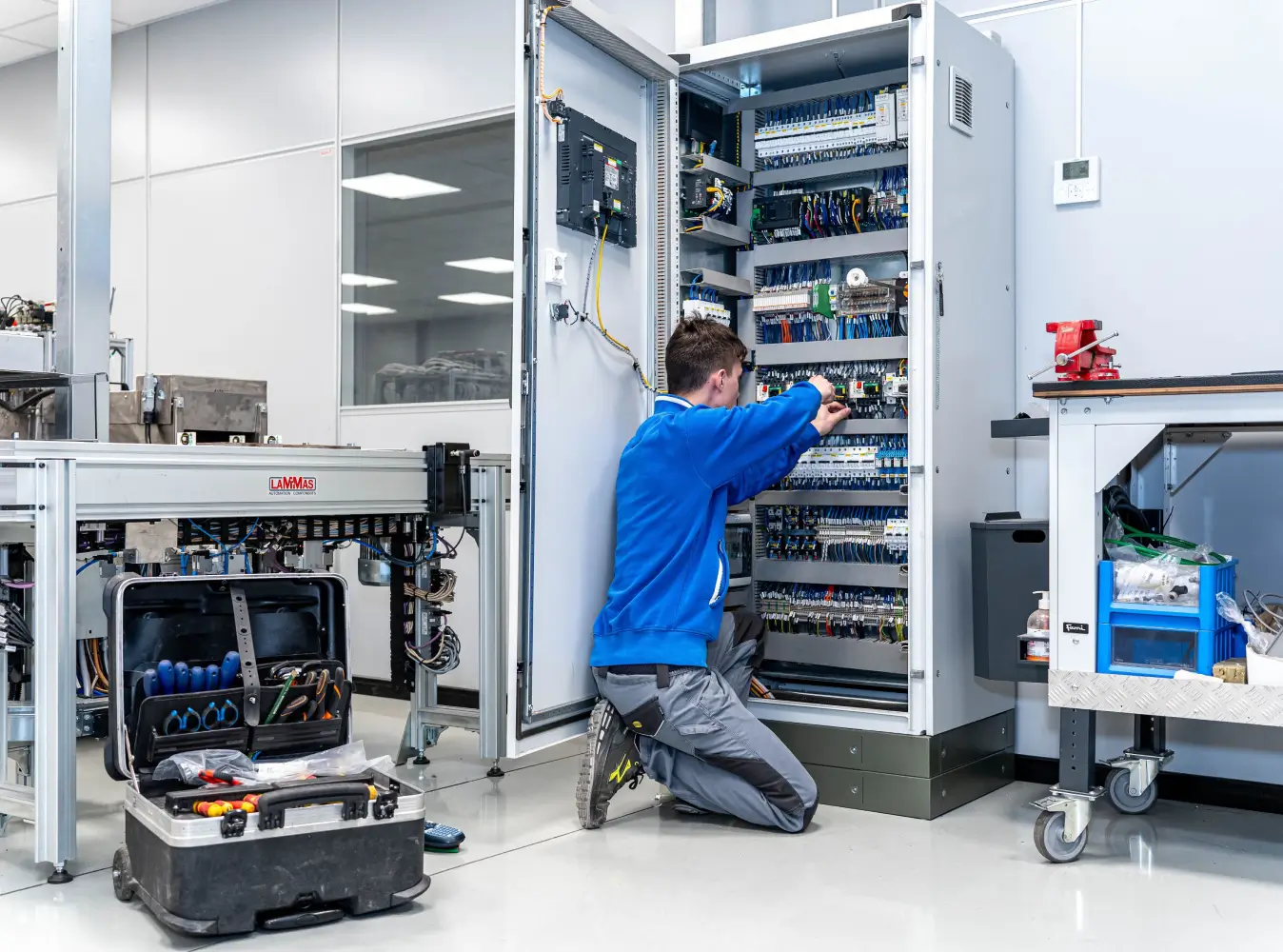 Progettiamo quadri elettrici per automazione industriale ottimizzati per gli spazi disponibili e le esigenze operative. Lo sviluppo dello schema elettrico viene gestito interamente dal nostro team, con una selezione accurata dei componenti in conformità alle normative vigenti e in base alle richieste specifiche del cliente. Una volta definito il progetto, realizziamo il quadro e i relativi collegamenti con precisione e cura.