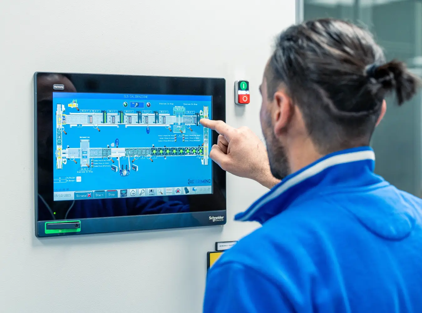 Programmiamo interfacce touch screen integrate con il PLC, progettando una grafica personalizzata e funzionale. L’interfaccia consente di controllare in tempo reale il funzionamento della macchina, scegliere tra modalità manuale o automatica, rilevare eventuali errori o anomalie e mantenere sempre sotto controllo l’operatività dell’impianto.